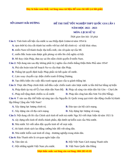 Đây là bản xem th , vu ử i lòng mua tài li u ệ đ xe ể m chi ti t ế (có l i ờ gi i ả ) SỞ GD&ĐT H I Ả DƯ N Ơ G Đ Ề THI TH Ử TỐT NGHI P Ệ THPT QU C Ố GIA L N Ầ 1 NĂM HỌC 2022 - 2023 MÔN: L C Ị H S 12 Ử Th i