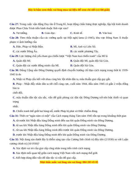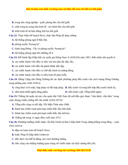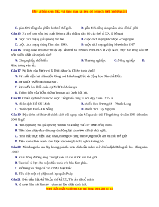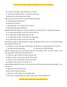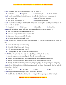 ầ thứ hai từ năm 1919-1929 V ở i t ệ Nam, th c ự dân Pháp đ u ầ tư v n nhi ố ều nhất vào ngành nào? A. Công nghi p ệ ch bi ế n. ế B. Thư ng ơ nghi p. ệ C. Nông nghi p. ệ D. Giao thông vận tải. Câu 17: S ki ự n ệ nào đư c ợ coi là kh i ở đầu c a ủ Chi n t ế ranh l nh? ạ A. S xu ự ất hi n ha ệ i nhà nư c ớ C ng hoà ộ Liên bang Đ c ứ và C ng hoà ộ Dân ch Đ ủ c ứ . B. S ra ự đ i ờ “K ho ế ạch Mácsan”. C. S ra ự đ i ờ hai kh i ố quân s N ự ATO và Vácsaya. D. Thông đi p c ệ a ủ T ng t ổ h ng ố Truman t i ạ Qu c ố h i ộ Mĩ. Câu 18: Chiến d c ị h mở màn cho cu c ộ T ng ổ ti n c ế ông và n i ổ d y X ậ uân 1975 là A. chiến d c ị h H Chí ồ Minh. B. chiến d c ị h Đư ng ờ 14 - Phư c ớ Long. 3 C. chiến d c ị h Huế - Đà Nẵng. D. chiến d c ị h Tây Nguyên. Câu 19: Đặc đi m ể n i ổ b t ậ v ề chính sách đ i ố ngo i ạ c a ủ Mĩ qua các đ i ờ T ng ổ th ng ố t ừ năm 1945 đ n ế năm 2000 là gì?