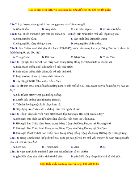 Đây là bản xem th , vu ử i lòng mua tài li u ệ đ xe ể m chi ti t ế (có l i ờ gi i ả ) Câu 7: L c ự lư ng ợ tham gia tích c c ự trong phong trào C n v ầ ư ng l ơ à A. tiểu t s ư ản. B. công nhân.