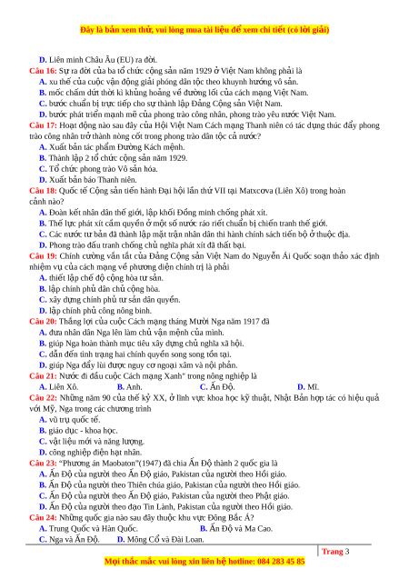 D. Liên minh Châu Âu (EU) ra đ i ờ . Câu 16: S ra ự đ i ờ c a ủ ba tổ ch c ứ c ng s ộ n nă ả m 1929 ở Vi t ệ Nam không phải là A. xu thế c a ủ cu c ộ vận đ ng gi ộ ải phóng dân t c ộ theo khuynh hư ng vô s ớ n. ả B. m c ố chấm d t ứ th i ờ kì kh ng ho ủ ng v ả đ ề ư ng ờ l i ố c a ủ cách m ng ạ Vi t ệ Nam. C. bư c ớ chuẩn b t ị r c ự ti p ế cho s t ự hành lập Đ ng C ả ng ộ sản Vi t ệ Nam. D. bư c ớ phát tri n m ể ạnh m c ẽ a