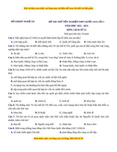 SỞ GD&ĐT NGHỆ AN Đ Ề THI TH Ử TỐT NGHI P Ệ THPT QU C Ố GIA L N Ầ 1 NĂM HỌC 2022 - 2023 MÔN: L C Ị H S 12 Ử Th i