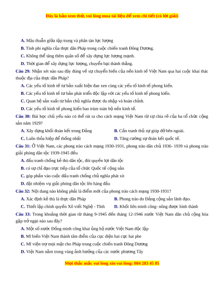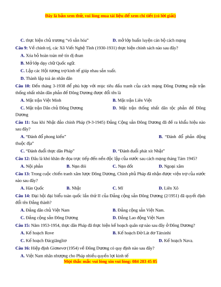 Câu 7: Tờ báo nào là cơ quan ngôn lu n ậ c a ủ H i ộ Liên hi p ệ thu c ộ đ a ị , do Nguy n ễ Ái Qu c ố làm chủ nhi m ệ , kiêm chủ bút? A. Báo đ ỏ B. Ngư i ờ cùng kh ổ C. Nhân dân D. Bùa Li m ề Câu 8: M t ộ trong nh ng ho ữ ạt đ ng c ộ a ủ Vi t ệ Nam Qu c ố dân đ ng (1927-1930) l ả à A. tổ ch c ứ kh i ở nghĩa Yên Bái B. phát đ ng t ộ ng ổ ti n c ế ông và n i ổ d y ậ M i ọ thắc m c