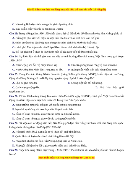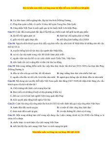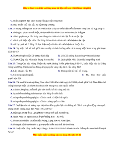 ớ ngày 6/3/1946, chính ph V ủ i t ệ Nam Dân chủ C ng hòa ộ th c ự hi n s ệ ách lư c ợ hòa hoãn v i ớ Trung Hoa Dân Qu c ố nh m ằ A. tránh trư ng ờ h p ph ợ ải đ i ố phó v i ớ nhi u k ề t ẻ hù cùng m t ộ lúc B. hạn chế s c ự h ng ố phá c a ủ th c ự dân Pháp m ở i n ề B c ắ C. c ng ủ c qua ố n h ngo ệ ại giao v i ớ các nư c ớ xã h i ộ ch nghĩ ủ a. D. c ng ủ c qua ố n h ngo ệ ại giao v i ớ các cư ng qu ờ c ố t b ư n. ả Câu 27: Sự ki n ệ nào tác đ ng ộ tr c ự ti p ế đ a ư đ n ế quy t ế đ nh ị c a ủ Đ ng ả và Chính ph ủ phát đ ng ộ toàn qu c ố kháng chiến ch ng ố th c ự dân Pháp (19/12/1946)? A. H i ộ ngh t ị rù bị Đ ở à Lạt gi a ữ ta và Pháp k t ế qu b ả t ị h t ấ b i ạ .