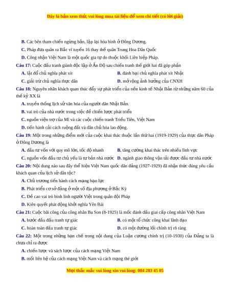 C. hoàn toàn đấu tranh tự giác D. có m t ộ đư ng l ờ i ố chính trị rõ ràng Câu 22: M t ộ trong nh ng ữ h n ạ chế trong n i ộ dung c a ủ Lu n ậ cư ng ơ chính trị (10-1930) c a ủ Đ ng ả ta là ch a ư ch ra ỉ đư c ợ A. chiến lư c ợ và sách lư c ợ c a ủ cách m ng ạ Vi t ệ Nam B. m i ố liên h c ệ a ủ cách m ng ạ Vi t ệ Nam và cách m ng t ạ hé gi i ớ M i ọ thắc m c