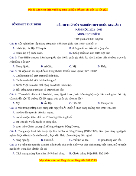 SỞ GD&ĐT THÁI BÌNH Đ Ề THI TH Ử TỐT NGHI P Ệ THPT QU C Ố GIA L N Ầ 1 NĂM HỌC 2022 - 2023 MÔN: L C Ị H S 12 Ử Th i