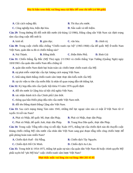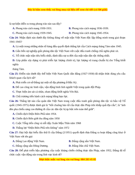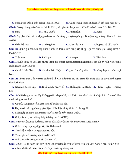 Đây là bản xem th , vu ử i lòng mua tài li u ệ đ xe ể m chi ti t ế (có l i ờ gi i ả ) C. Phong trào Đ ng kh ồ i ở thắng l i ợ năm 1960. D. Cu c ộ kháng chiến ch ng ố Mỹ k t ế thúc năm 1975. Câu 8: Trong nh ng ữ năm 30 c a ủ th k ế ỉ XX, qu c ố gia nào đư c ợ xem là “lò l a ử chi n t ế ranh” c ở hâu Á? A. Đ c ứ B. Trung Qu c ố . C. Nhật Bản. D. Italia.