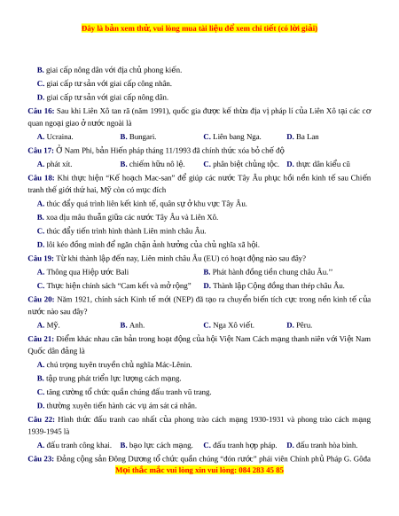 ổ chính sách hòa bình, trung l p ậ tích c c ự , luôn luôn ng ủ h ộ cu c ộ đ u ấ tranh giành đ c ộ l p ậ c a ủ các dân t c ộ ” là đư ng ờ l i ố đ i ố ngo i ạ c a ủ qu c ố gia nào sau đây? A. Mỹ. B. Ấn Đ . ộ C. Liên Xô. D. Campuchia. Câu 5: M t ộ trong nh ng ho ữ ạt đ ng c ộ a ủ Nguy n Á ễ i Qu c ố P ở háp trong nh ng ữ năm 1919-1923 là: A. mở l p đà ớ o tạo cán b c ộ ách mạng.