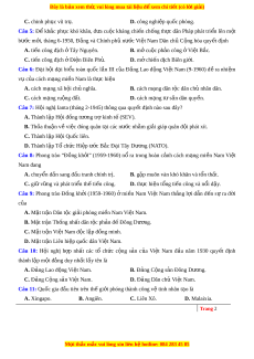 C. xóa bỏ tình trạng nghèo nàn, l c ạ h u ậ trong khu v c ự . D. tăng cư ng ờ h p ợ tác phát tri n ể kinh t ế và văn hóa. Câu 15: Chi n ế thắng Vi t ệ B c ắ thu - đông năm 1947 c a ủ quân dân Vi t ệ Nam đã A. bảo v ệ an toàn c ơ quan đ u ầ não kháng chi n ế . B. làm thất bại k ế ho c ạ h Rove c a ủ Pháp. C. làm thất bại k ế ho c ạ h Đà Lát đ ơ Tátxinh ịc a ủ Pháp. D. làm thất bại k ế ho c ạ h Nava c a ủ Pháp. Câu 16: Ở Vi t ệ Nam, cu i