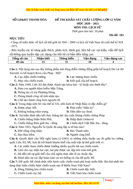 SỞ GD&ĐT THANH HÓA Đ Ề THI KH O Ả SÁT CH T Ấ LƯ NG Ợ L P Ớ 12 NĂM H C Ọ 2020 – 2021 MÔN THI: L CH Ị S Ử Th i