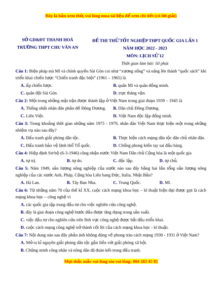 Đề thi thử Lịch sử trường Chu Văn An - Thanh Hóa lần 1 năm 2023