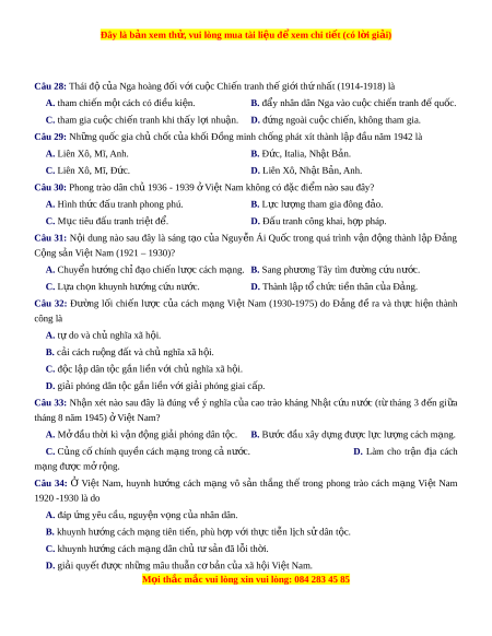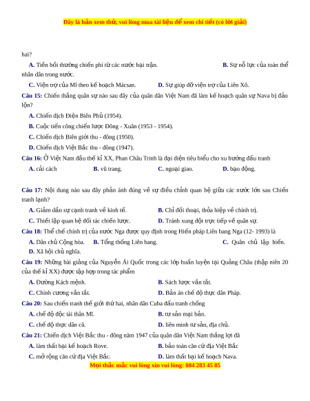 p Liên bang Nga (12- 1993) là A. Dân chủ C ng hòa ộ . B. T ng ổ th ng ố Liên bang. C. Quân chủ l p ậ hi n. ế D. Xã h i ộ ch nghĩ ủ a. Câu 19: Nh ng ữ bài gi ng ả c a ủ Nguy n ễ Ái Qu c ố trong các l p ớ hu n ấ luy n ệ t i ạ Qu ng ả Châu (th p ậ niên 20 c a ủ th k ế X ỉ X) đư c ợ t p h ậ p t ợ rong tác ph m ẩ A. Đư ng K ờ ách m nh. ệ B. Sách lư c ợ v n t ắ t ắ . C. Chính cư ng v ơ ắn tắt. D. Bản án ch đ ế t ộ h c ự dân Pháp.