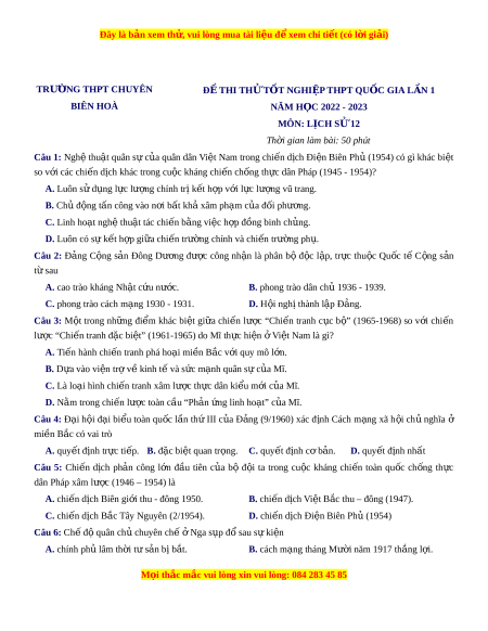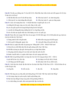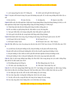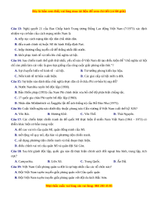 Câu 1: Nghệ thuật quân s ự c a ủ quân dân Vi t ệ Nam trong chi n ế d c ị h Đi n Bi ệ ên Ph ủ (1954) có gì khác bi t ệ so v i ớ các chi n d ế c ị h khác trong cu c ộ kháng chi n c ế h ng ố th c ự dân Pháp (1945 - 1954)? A. Luôn s d ử ng l ụ c ự lư ng c ợ hính trị k t ế h p v ợ i ớ l c ự lư ng vũ t ợ rang. B. Ch đ ủ ng t ộ ấn công vào n i ơ bất khả xâm phạm c a ủ đ i ố phư ng. ơ C. Linh hoạt ngh t ệ huật tác chi n b ế ằng vi c ệ h p đ ợ ng bi ồ nh ch ng. ủ D. Luôn có s k ự t ế h p gi ợ a ữ chi n t ế rư ng ờ chính và chi n ế trư ng ph ờ . ụ Câu 2: Đảng C ng ộ sản Đông Dư ng ơ đư c ợ công nh n ậ là phân bộ đ c ộ l p, ậ tr c ự thu c ộ Qu c ố t ế C ng ộ s n ả t s ừ au