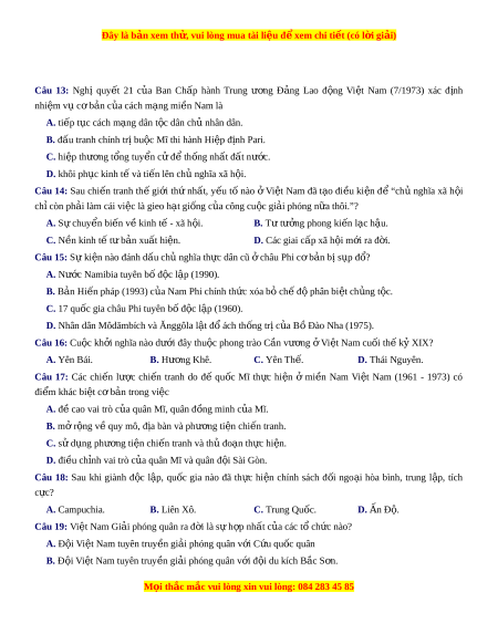 Đây là bản xem th , vu ử i lòng mua tài li u ệ đ xe ể m chi ti t ế (có l i ờ gi i ả ) Câu 13: Nghị quy t ế 21 c a ủ Ban Ch p ấ hành Trung ư ng ơ Đ ng ả Lao đ ng ộ Vi t ệ Nam (7/1973) xác đ nh ị nhi m ệ vụ c b ơ ản c a