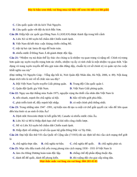 Đây là bản xem th , vu ử i lòng mua tài li u ệ đ xe ể m chi ti t ế (có l i ờ gi i ả ) C. C u ứ qu c ố quân v i ớ du kích Thái Nguyên. D. C u ứ qu c ố quân v i ớ đ i ộ du kích B c ắ S n. ơ Câu 20: Hi p h ệ i ộ các qu c