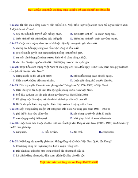 Câu 18: Sau khi giành đ c ộ l p, ậ qu c ố gia nào đã th c ự hi n ệ chính sách đ i ố ngo i ạ hòa bình, trung l p, ậ tích c c ự ? A. Campuchia. B. Liên Xô. C. Trung Qu c ố . D. Ấn Đ . ộ Câu 19: Vi t ệ Nam Gi i ả phóng quân ra đ i ờ là s h ự p nh ợ t ấ c a ủ các t c ổ h c ứ nào? A. Đ i ộ Vi t ệ Nam tuyên truy n gi ề i ả phóng quân v i ớ C u qu ứ c ố quân B. Đ i ộ Vi t ệ Nam tuyên truy n gi ề i ả phóng quân v i ớ đ i ộ du kích B c ắ S n. ơ M i ọ thắc m c