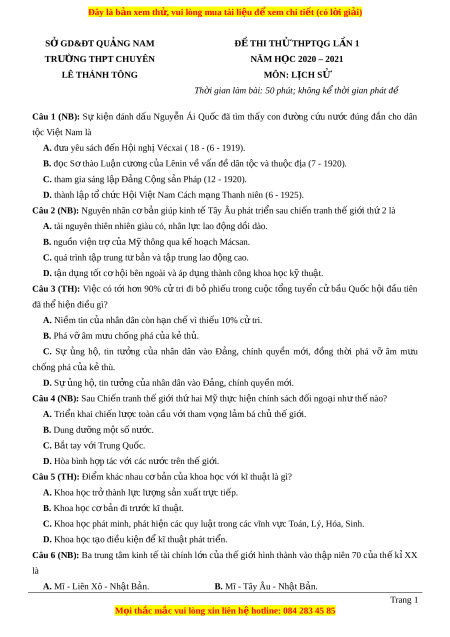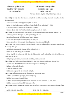 Đề thi thử Lịch Sử trường Chuyên Lê Thánh Tông lần 1 năm 2021