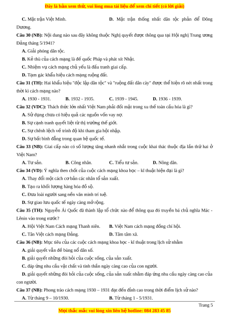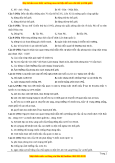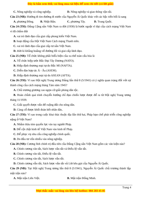 D. Do đầu tư v n nhi ố ều vào nông nghiệp. Câu 28 (NB): Cư ng ơ lĩnh chính trị đ u t ầ iên c a ủ Đ ng C ả ng s ộ n ả Vi t ệ Nam g m ồ các văn ki n nà ệ o? A. Chính cư ng ơ văn tắt, Sách lư c ợ v n t ắ t ắ và Đi u l ề v ệ n t ắ t ắ . B. Chính cư ng vă ơ n t t ấ , Đi u l ề v ệ n t ắ t ắ . C. Chính cư ng ơ văn tắt, Sách lư c ợ v n t ắ t ắ . D. Chính cư ng ơ vẫn t t ắ , Sách lư c ợ v n t ắ t ắ v L ả i ờ kêu g i ọ c a ủ Nguy n Á ễ i Qu c ố . Câu 29 (NB): Tại H i ộ nghị Trung ư ng ơ l n ầ thứ 8 (5/1941), Nguy n ễ Ái Qu c ố chủ trư ng ơ thành l p ậ mặt trận nào?