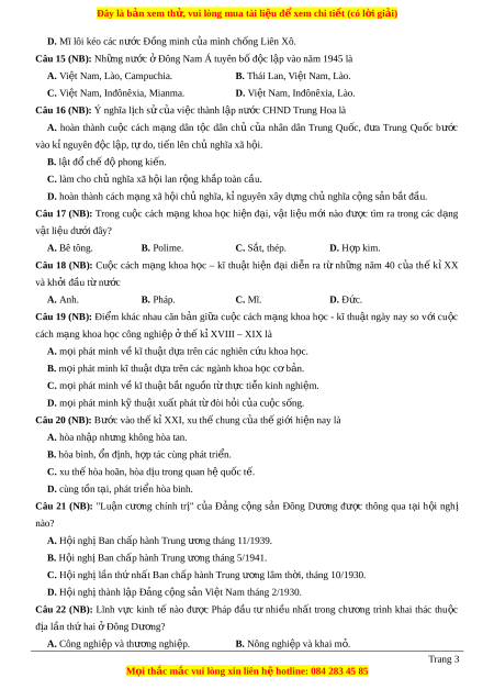 Câu 16 (NB): Ý nghĩa l c ị h s c ử a ủ vi c ệ thành l p n ậ ư c ớ CHND Trung Hoa là A. hoàn thành cu c ộ cách m ng ạ dân t c ộ dân chủ c a ủ nhân dân Trung Qu c ố , đ a ư Trung Qu c ố bư c ớ vào k nguyê ỉ n đ c ộ lập, t do, t ự i n ế lên chủ nghĩa xã h i ộ . B. lật đ c ổ hế đ phong ki ộ ến. C. làm cho ch nghĩ ủ a xã h i ộ lan r ng ộ khắp toàn c u. ầ