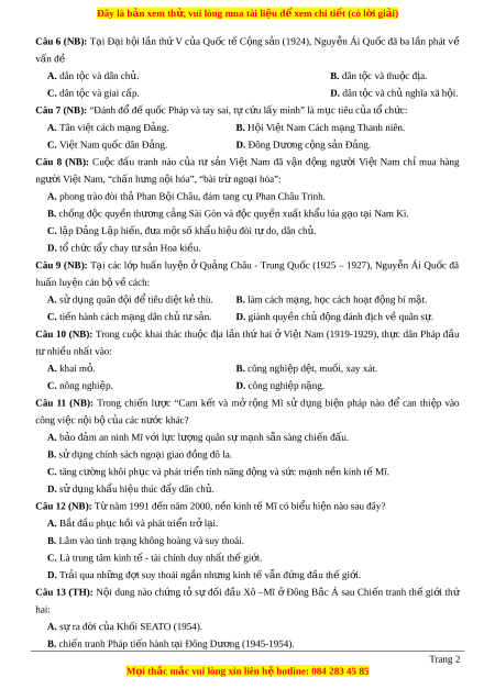 ố Pháp và tay sai, tự c u ứ l y m ấ ình” là m c ụ tiêu c a ủ t c ổ h c ứ : A. Tân vi t ệ cách mạng Đảng. B. H i ộ Vi t ệ Nam Cách m ng ạ Thanh niên. C. Vi t ệ Nam qu c ố dân Đ ng. ả D. Đông Dư ng ơ c ng s ộ n Đ ả ảng. Câu 8 (NB): Cu c ộ đấu tranh nào c a ủ tư s n ả Vi t ệ Nam đã v n ậ đ ng ộ ngư i ờ Vi t ệ Nam chỉ mua hàng ngư i ờ Vi t ệ Nam, “chấn h ng ư n i