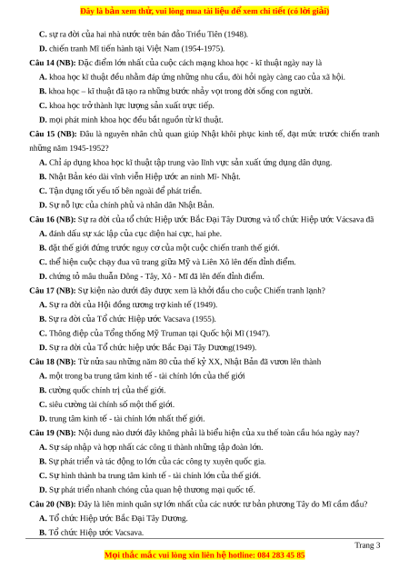 Câu 20 (NB): Đây là liên minh quân s l ự n nh ớ t ấ c a ủ các nư c ớ t b ư n ph ả ư ng ơ Tây do Mĩ c m ầ đ u? ầ A. Tổ ch c ứ Hiệp ư c ớ Bắc Đại Tây Dư ng. ơ B. Tổ ch c ứ Hi p ệ ư c ớ Vacsava. Trang 3 M i ọ thắc m c