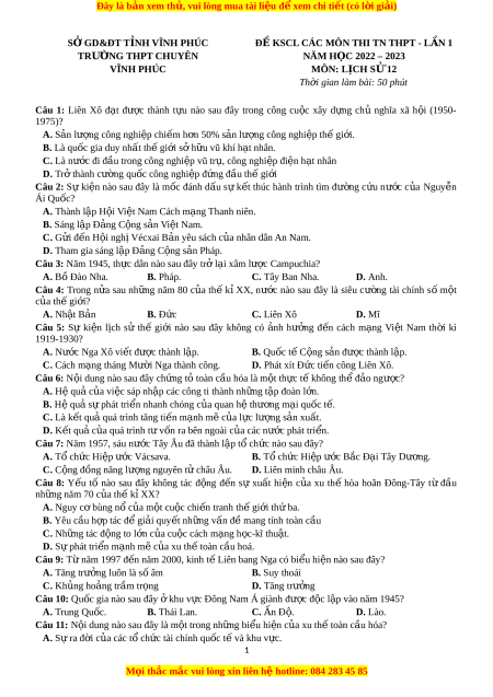 Đề thi thử Lịch sử trường Chuyên Vĩnh Phúc lần 1 năm 2023