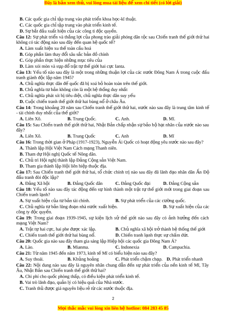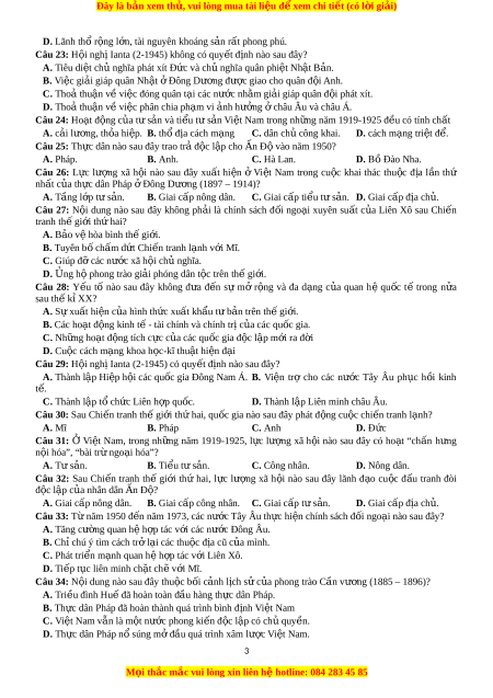 ố gia nào sau đây phát đ ng c ộ u c ộ chi n t ế ranh l nh? ạ A. Mĩ B. Pháp C. Anh D. Đ c ứ Câu 31: Ở Vi t ệ Nam, trong nh ng ữ năm 1919-1925, l c ự lư ng ợ xã h i ộ nào sau đây có ho t ạ “ch n ấ h ng ư n i ộ hóa”, “bài tr ngo ừ ại hóa”? A. T s ư ản. B. Tiểu t s ư n. ả C. Công nhân. D. Nông dân. Câu 32: Sau Chi n ế tranh thế gi i ớ thứ hai, l c ự lư ng ợ xã h i ộ nào sau đây lãnh đ o ạ cu c ộ đ u ấ tranh đòi đ c ộ lập c a ủ nhân dân Ấn Đ ? ộ
