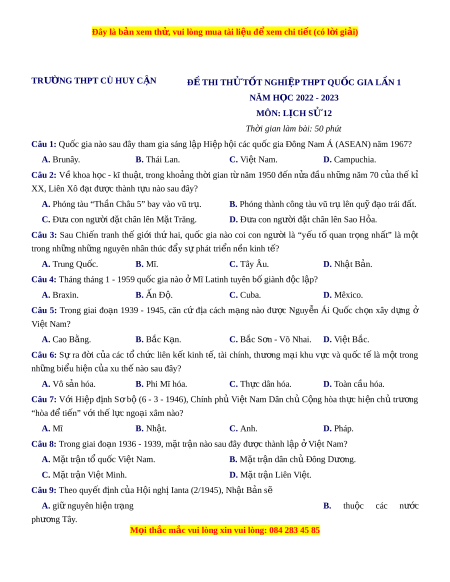 TRƯỜNG THPT CÙ HUY C N Ậ Đ Ề THI TH Ử TỐT NGHI P Ệ THPT QU C Ố GIA L N Ầ 1 NĂM HỌC 2022 - 2023 MÔN: L C Ị H S 12 Ử Th i