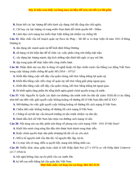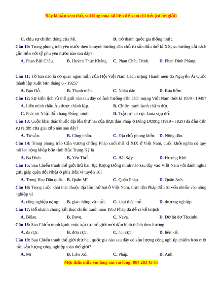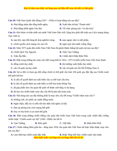 Đây là bản xem th , vu ử i lòng mua tài li u ệ đ xe ể m chi ti t ế (có l i ờ gi i ả ) Câu 20: Vi t ệ Nam Qu c ố dân đ ng (1927 - 1930) c ả ó ho t ạ đ ng nà ộ o sau đây? A. Phát đ ng nhâ ộ n dân t ng ổ kh i ở nghĩa.