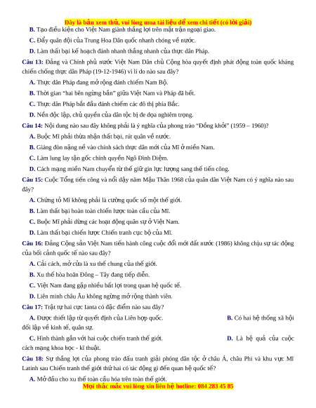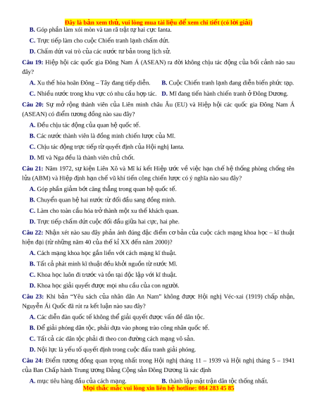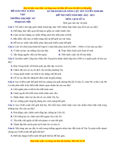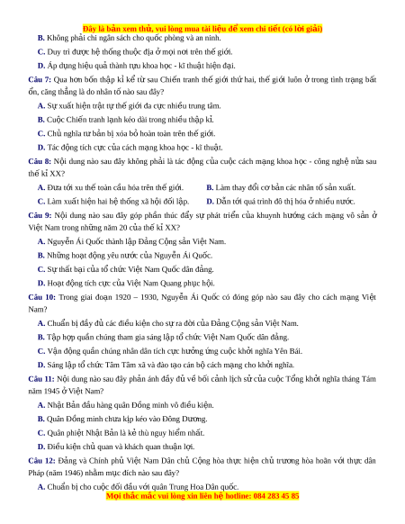 B. Không phải chi ngân sách cho qu c ố phòng và an ninh. C. Duy trì đư c ợ h t ệ h ng ố thu c ộ đ a ị m ở i ọ n i ơ trên th gi ế i ớ . D. Áp d ng hi ụ u ệ quả thành t u khoa ự h c ọ - kĩ thu t ậ hi n đ ệ i ạ . Câu 7: Qua h n ơ b n ố th p ậ kỉ kể từ sau Chi n ế tranh thế gi i ớ thứ hai, th ế gi i ớ luôn ở trong tình tr ng ạ b t ấ n, c ổ