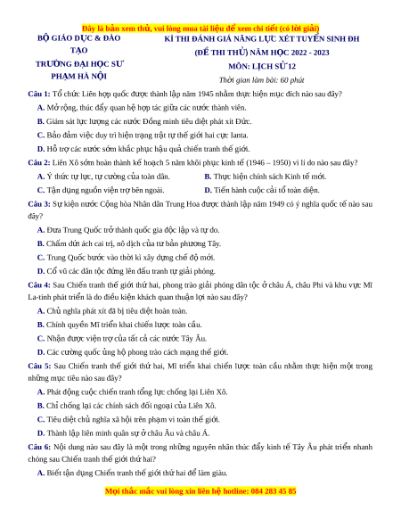 ờ gian làm bài: 60 phút Câu 1: Tổ ch c ứ Liên h p qu ợ c ố đư c ợ thành l p nă ậ m 1945 nh m ằ th c ự hi n ệ m c ụ đích nào sau đây? A. M r ở ng, t ộ húc đẩy quan hệ h p t ợ ác gi a ữ các nư c ớ thành viên. B. Giám sát l c ự lư ng ợ các nư c ớ Đ ng m ồ inh tiêu di t ệ phát xít Đ c ứ . C. Bảo đảm vi c ệ duy trì hi n t ệ rạng trật t t ự h gi ế i ớ hai c c ự Ianta. D. H t ỗ rợ các nư c ớ s m ớ khắc ph c ụ hậu quả chi n ế tranh th gi ế i ớ . Câu 2: Liên Xô s m ớ hoàn thành k ho ế ạch 5 năm khôi ph c