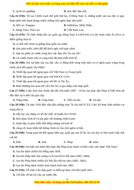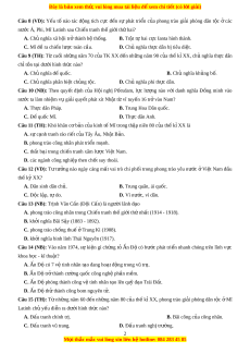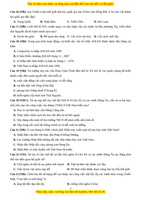 Đây là bản xem th , vu ử i lòng mua tài li u ệ đ xe ể m chi ti t ế (có l i ờ gi i ả ) Câu 16 (NB): Sau Chi n ế tranh thế gi i ớ thứ hai, qu c ố gia nào ở khu v c ự Đông B c ắ Á b ịchia c t ắ thành hai qu c ố gia đ c ộ l p? ậ A. Trung Qu c ố . B. Nhật Bản. C. Triều Tiên. D. Đài Loan. Câu 17 (NB): Cu i ố thế kỉ XIX, trư c ớ nguy cơ xâm lư c ợ c a ủ các nư c ớ tư b n ả phư ng ơ Tây, tri u ề đình
