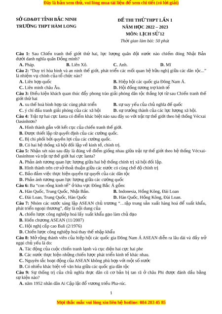 ờ gian làm bài: 50 phút Câu 1: Sau Chi n ế tranh thế gi i ớ thứ hai, l c ự lư ng ợ quân đ i ộ nư c ớ nào chi m ế đóng Nh t ậ B n ả dư i ớ danh nghĩa quân Đ ng m ồ inh? A. Pháp. B. Liên Xô. C. Anh. D. Mĩ