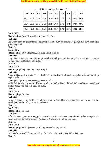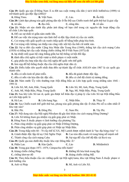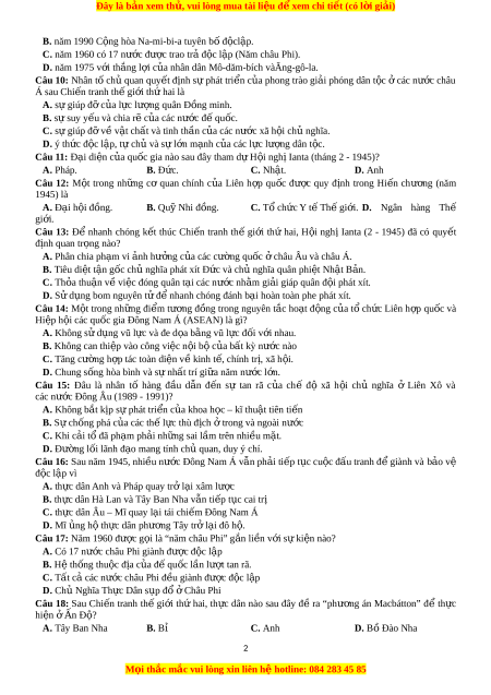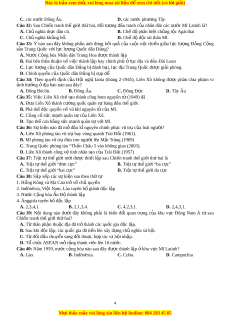 D. Trật tự thế gi i ớ đa c c ự Câu 38: Sắp x p c ế ác s ki ự n s ệ au theo thứ tự 1. H ng K ồ ông và Ma Cao trở v c ề hủ quy n ề 2. Inđônêxia, Vi t ệ Nam, Lào tuyên b gi ố ành đ c ộ l p ậ 3. Nư c ớ C ng hòa ộ n Đ Ấ t ộ hành lập 4. Ănggola tuyên b đ ố c ộ lập A. 2,3,4,1. B. 2,1,3,4. C. 4,2,3,1. D. 2,4,3,1. Câu 39: N i ộ dung nào dư i ớ đây không ph i ả là bi n ế đ i ổ quan tr ng ọ c a ủ khu v c ự Đông Nam Á từ sau Chiến tranh th gi ế i ớ th ha ứ i? A. T t ừ hân phận thu c ộ đ a