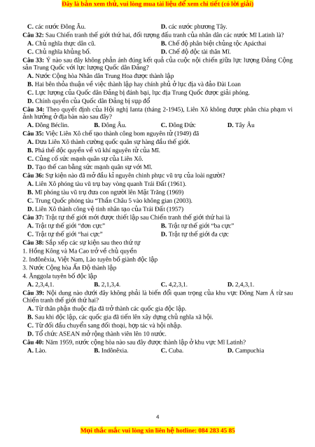 ệ đ xe ể m chi ti t ế (có l i ờ gi i ả ) C. các nư c ớ Đông Âu. D. các nư c ớ phư ng ơ Tây. Câu 32: Sau Chi n t ế ranh th gi ế i ớ thứ hai, đ i ố tư ng ợ đ u t ấ ranh c a ủ nhân dân các nư c ớ Mĩ Latinh là? A. Ch nghĩ ủ a th c ự dân cũ. B. Chế đ phâ ộ n bi t ệ ch ng t ủ c ộ Apácthai C. Ch nghĩ ủ a kh ng b ủ . ố D. Chế đ đ ộ c ộ tài thân Mĩ.