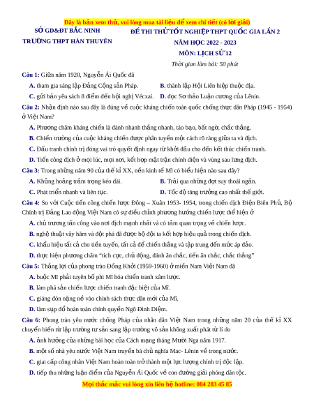 Đề thi thử Lịch sử trường Hàn Thuyên - Bắc Ninh lần 2 năm 2023