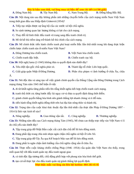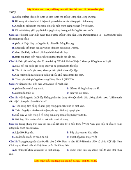 ệ đ xe ể m chi ti t ế (có l i ờ gi i ả ) 1945)? A. Đề ra đư ng ờ l i ố chi n l ế ư c ợ và sách lư c ợ cho Đ ng C ả ng s ộ n Đ ả ông Dư ng. ơ B. B s ổ ung và hoàn ch nh ỉ lí luận v qua ề n đi m ể tư s n dâ ả n quy n c ề ách m ng. ạ C. Chuẩn b đi ị ều ki n ệ cho s ra ự đ i ờ c a ủ m t ộ chính đ ng vô s ả n ả ở Vi t ệ Nam. D. Đã mở đư ng gi ờ ải quy t ế tình tr ng kh ạ ng ủ ho ng v ả đ ề ư ng l ờ i ố c u n ứ ư c ớ . Câu 15: H i ộ nghị Ban Ch p ấ hành Trung ư ng ơ Đ ng ả C ng ộ s n ả Đông Dư ng ơ (tháng 11 – 1939) đư c ợ tri u ệ tập trong b i ố cảnh