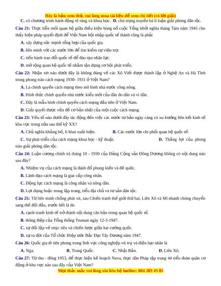 Câu 23: Yếu tố nào dư i ớ đây tác đ ng ộ đ n ế vi c ệ các nư c ớ t ư b n ả ngày càng có xu hư ng ớ liên k t ế kinh tế khu v c ự trong n a ử sau thế kỷ XX? A. Chủ nghĩa kh ng b ủ , ố li khai xuất hi n. ệ B. Các nư c ớ l n c ớ hi ph i ố quan h qu ệ c ố t . ế C. S phá ự t tri n c ể a ủ cách mạng khoa h c ọ - k t ỹ hu t ậ . D. Thắng l i ợ c a ủ phong trào giải phóng dân t c ộ . Câu 24: Luận cư ng