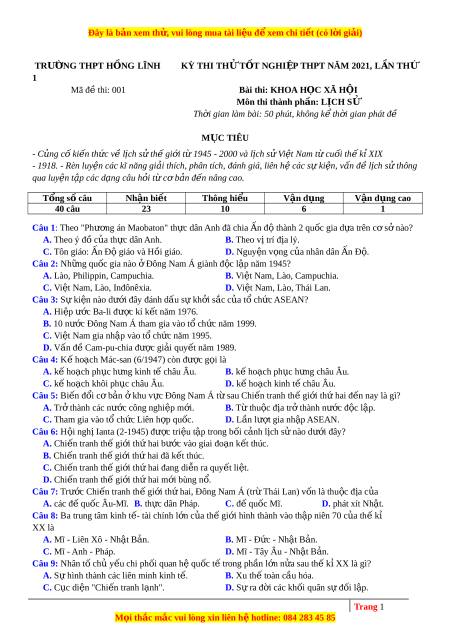 Đề thi thử Lịch Sử trường Hồng Lĩnh lần 1 năm 2021