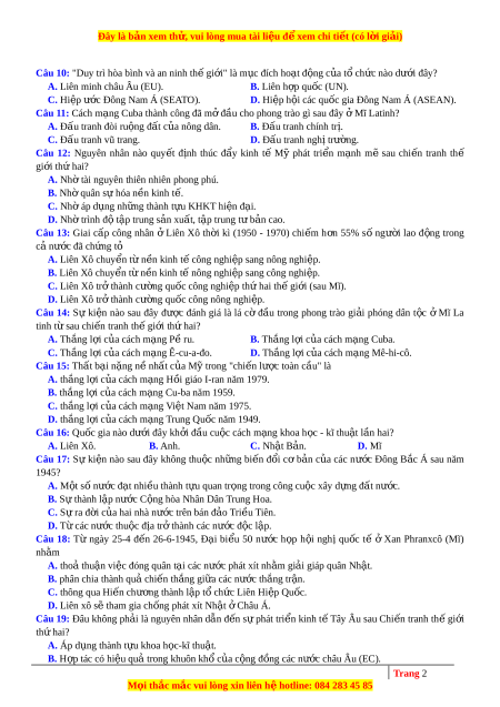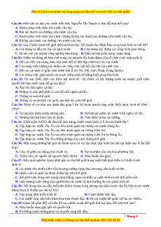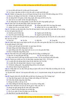 C. Tham gia vào tổ ch c ứ Liên h p ợ qu c ố . D. Lần lư t ợ gia nhập ASEAN. Câu 6: H i ộ ngh Ia ị nta (2-1945) đư c ợ tri u t ệ p t ậ rong b i ố c nh l ả c ị h s nà ử o dư i ớ đây? A. Chiến tranh th gi ế i ớ thứ hai bư c ớ vào giai đo n k ạ t ế thúc. B. Chiến tranh th gi ế i ớ th ha ứ i đã k t ế thúc. C. Chiến tranh th gi ế i ớ thứ hai đang di n ra ễ quy t ế li t ệ . D. Chiến tranh th gi ế i ớ thứ hai m i ớ bùng n . ổ Câu 7: Trư c ớ Chi n t ế ranh th gi ế i ớ th ha ứ i, Đông Nam Á (tr ừ Thái Lan) v n ố là thu c ộ đ a ị c a ủ A. các đế qu c ố Âu-Mĩ. B. th c ự dân Pháp. C. đế qu c ố Mĩ. D. phát xít Nhật.