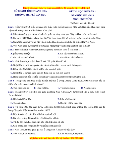 ệ đ xe ể m chi ti t ế (có l i ờ gi i ả ) SỞ GD&ĐT T N Ỉ H THANH HOÁ Đ Ề THI H C Ọ TH L Ử N Ầ 1 TRƯ N Ờ G THPT LÊ VĂN H U Ư NĂM H C Ọ 2022 - 2023 MÔN: L C Ị H S 12 Ử Th i