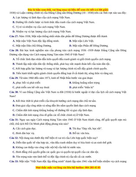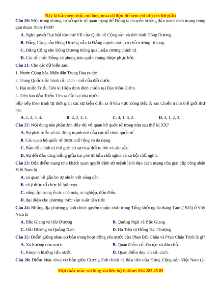 ệ đ xe ể m chi ti t ế (có l i ờ gi i ả ) Câu 20: M t ộ trong nh ng ữ cơ s ở qu c ố tế quan tr ng ọ đ Đ ể ng ả ta chuy n ể hư ng ớ đ u ấ tranh cách m ng ạ trong giai đoạn 1936-1939? A. Ngh quy ị t ế Đại h i ộ lần th ứ VII c a ủ Qu c ố t C ế ng s ộ n và ả tình hình Đông Dư ng. ơ B. Đảng C ng s ộ ản Đông Dư ng v ơ