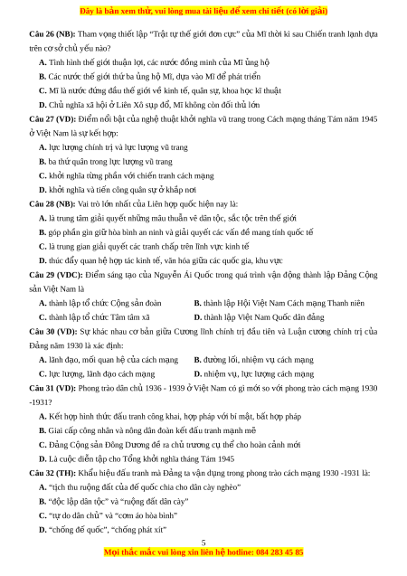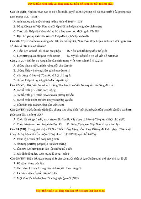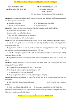 D. Mỹ bắt đầu bảo trợ về vấn đề hạt nhân Câu 21 (VD): Nhi m ệ v hà ụ ng đầu c a ủ cách mạng Vi t ệ Nam đầu th k ế X ỉ X là: A. ch ng phong ki ố ến, giành ru ng đ ộ ất cho dân cày B. ch ng ố Pháp và phong ki n, gi ế ành quy n t ề t ự rị C. xây d ng và ự bảo vệ Tổ qu c ố xã h i ộ chủ nghĩa D. ch ng P ố háp và tay sai, giành đ c ộ l p dâ ậ n t c ộ Câu 22 (VD): H i ộ Vi t ệ Nam Cách m ng ạ Thanh niên và Vi t ệ Nam qu c ố dân đ ng đ ả u l ề à: A. các t c ổ h c ứ yêu nư c ớ cách mạng B. các tổ ch c ứ yêu nư c ớ theo khuynh hư ng ớ t s ư n ả C. các t c ổ h c ứ chính tr t ị heo khuynh hư ng vô s ớ n ả D. tiền thân c a ủ Đảng C ng s ộ n ả Vi t ệ Nam Câu 23 (TH): Sự ki n ệ nào đánh d u