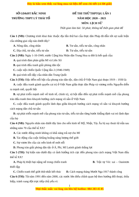 Đề thi thử Lịch Sử trường Lý Thái Tổ lần 1 năm 2021
