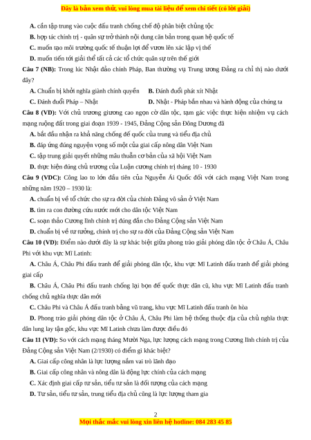 C. soạn thảo Cư ng l ơ ĩnh chính tr đúng đ ị n c ắ ho Đ ng C ả ng s ộ n ả Vi t ệ Nam D. chuẩn b v ị ề t t ư ư ng, ở chính trị cho s ra ự đ i ờ c a ủ Đ ng C ả ng s ộ n ả Vi t ệ Nam Câu 10 (VD): Đi m ể nào dư i ớ đây là sự khác bi t ệ gi a ữ phong trào gi i ả phóng dân t c ộ ở Châu Á, Châu Phi v i ớ khu v c ự Mĩ Latinh: