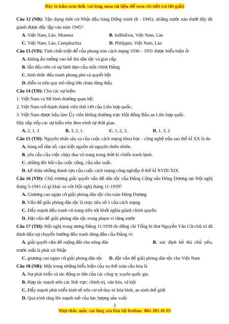 Câu 12 (NB): Tận d ng ụ th i ờ cơ Nh t ậ đ u ầ hàng Đ ng ồ minh (8 - 1945), nh ng ữ nư c ớ nào dư i ớ đây đã giành đư c ợ đ c ộ lập vào năm 1945? A. Vi t ệ Nam, Lào, Mianma B. Inđônêxia, Vi t ệ Nam, Lào C. Vi t ệ Nam, Lào, Camphuchia D. Philippin, Vi t ệ Nam, Lào