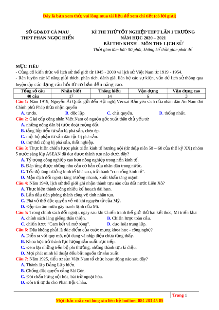 Đề thi thử Lịch Sử trường Phan Ngọc Hiển lần 1 năm 2021