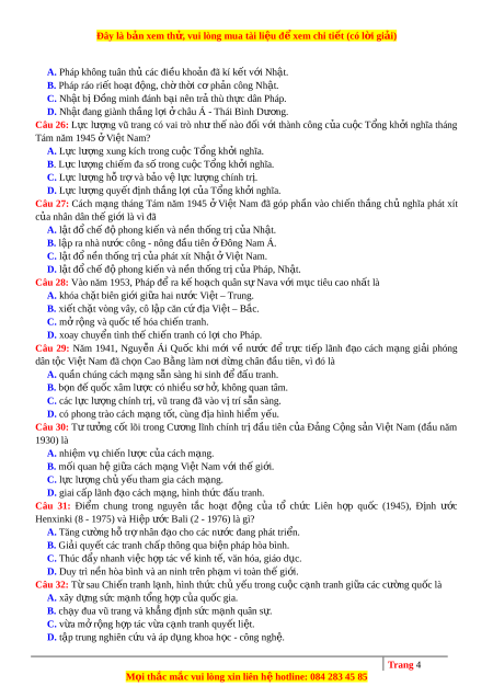 ở hâu Á - Thái Bình Dư ng. ơ Câu 26: L c ự lư ng ợ vũ trang có vai trò nh ư th ế nào đ i ố v i ớ thành công c a ủ cu c ộ T ng ổ kh i ở nghĩa tháng Tám năm 1945 ở Vi t ệ Nam? A. L c ự lư ng ợ xung kích trong cu c ộ T ng ổ kh i ở nghĩa. B. L c ự lư ng c ợ hi m ế đa số trong cu c ộ T ng ổ kh i ở nghĩa. C. L c ự lư ng ợ h t ỗ rợ và bảo v l ệ c ự lư ng c ợ hính tr . ị D. L c ự lư ng ợ quy t ế đ nh ị th ng l ắ i ợ c a ủ T ng ổ kh i ở nghĩa.