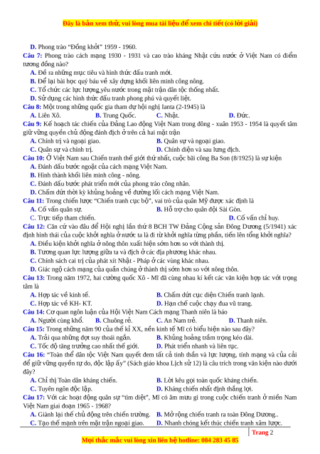 ả cách trong phong trào yêu nư c ớ , cách m ng ạ ở Vi t ệ Nam đ u ầ thế k X ỉ X đ u g ề ắn liền v i ớ A. Nhi m ệ v c ụ h ng ố đ qu ế c ố . B. B ph ộ ận sĩ phu yêu nư c ớ . C. Giai cấp t s ư n dâ ả n t c ộ . D. Tư tư ng ở bạo đ ng vũ t ộ rang. Trang 3 M i ọ thắc m c