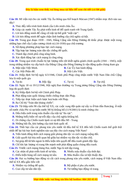 Đây là bản xem th , vu ử i lòng mua tài li u ệ đ xe ể m chi ti t ế (có l i ờ gi i ả ) Câu 18: Mĩ vi n ệ tr ợ cho các nư c ớ Tây Âu thông qua K ế ho c ạ h Mácsan (1947) nh m ằ m c ụ đích nào sau đây? A. Thúc đẩy ti n ế trình hình thành c a ủ Liên minh châu Âu. B. Giúp các nư c ớ Tây Âu phát tri n ki ể nh t đ ế c ể nh t ạ ranh v i ớ Trung Qu c ố . C. Lôi kéo đ ng ồ minh đ c ể ng ủ c t ố r t ậ t t ự h gi ế i ớ “m t ộ c c ự ”. D. Lôi kéo đ ng ồ minh đ ngă ể n chặn ảnh hư ng c ở a ủ chủ nghĩa xã h i ộ .