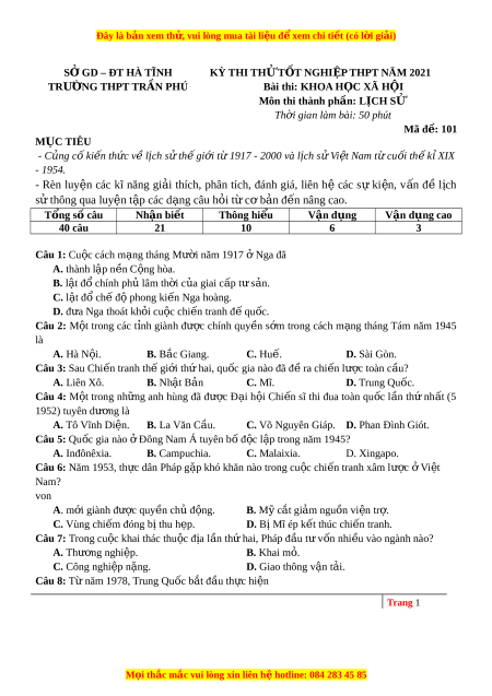 SỞ GD – ĐT HÀ TĨNH KỲ THI TH Ử T T Ố NGHI P Ệ THPT NĂM 2021 TRƯ NG Ờ THPT TR N Ầ PHÚ Bài thi: KHOA H C Ọ XÃ H I Ộ Môn thi thành ph n ầ : L CH Ị S Ử Th i